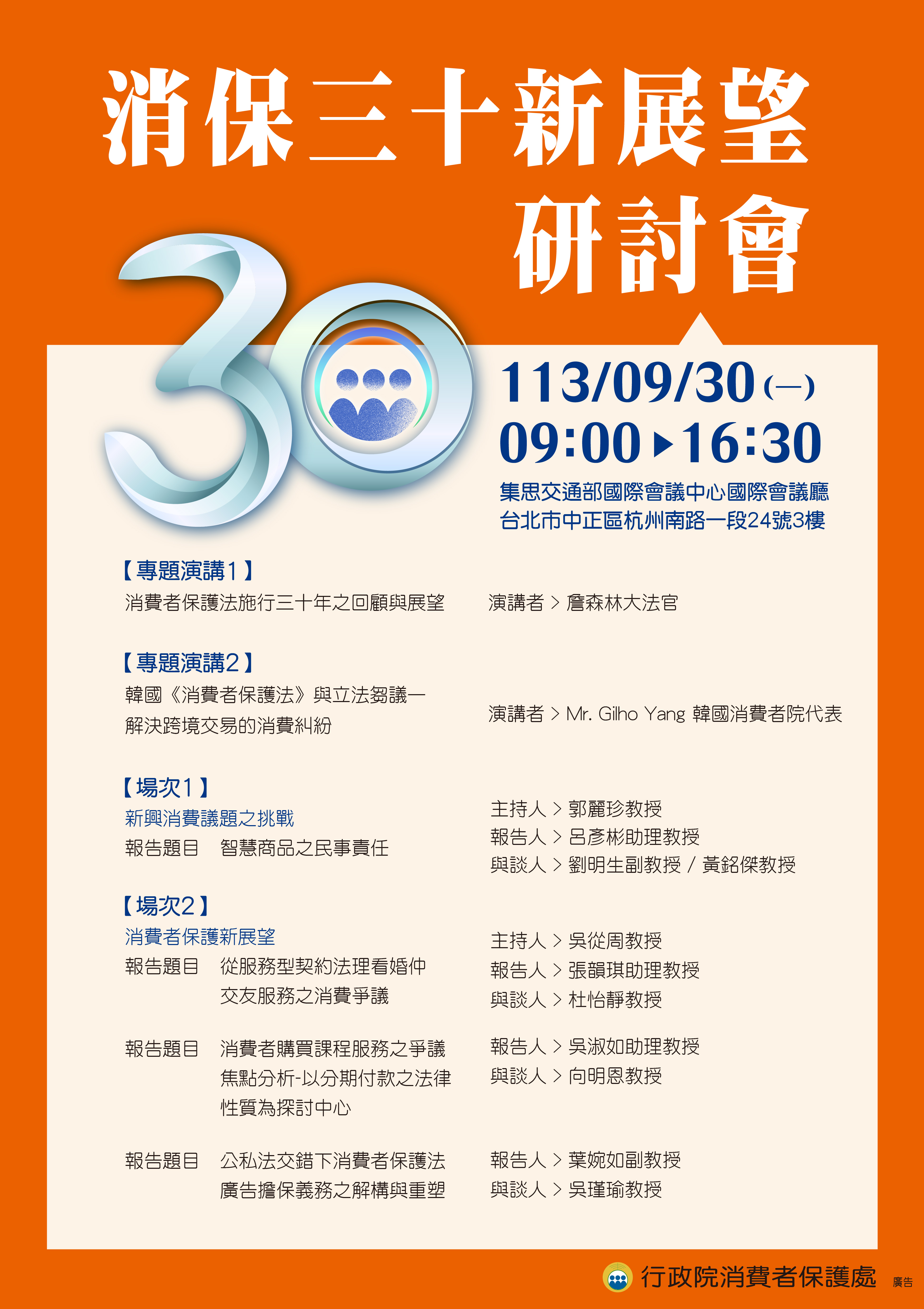 2024-09-12 16:13:21 時間:本年9月30日(星期一)上午9時至下午4時30分。 地點:集思交通部國際會議中心國際會議廳(地址:臺北市中正區杭州南路一段24號)。 會議議程:2場專題演講、新興消費議題之挑戰、消費者保護新展望。 報名方式:採線上報名。請線上參加人員於9月20日前至報名網址:https://reurl.cc/Kl9nAM,完成報名作業,網路連結將於會議前另行提供。 議程下載 海報下載 上一頁